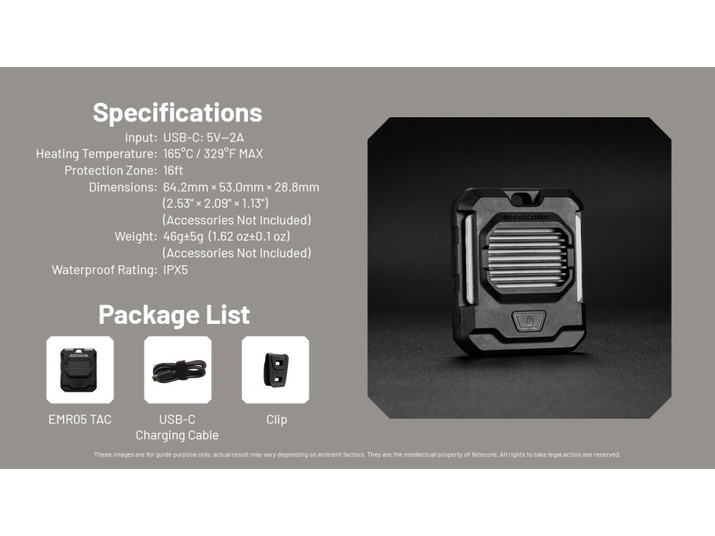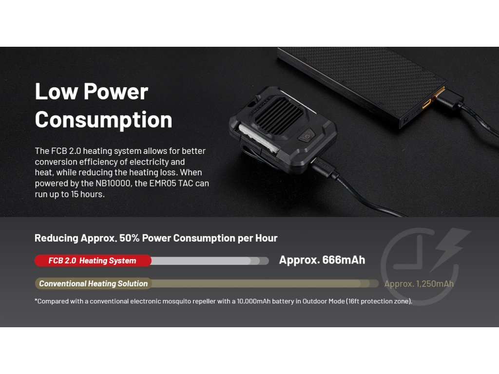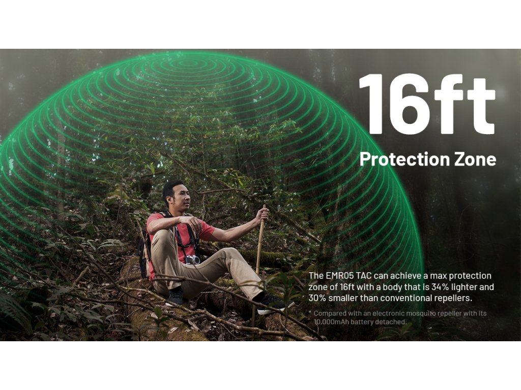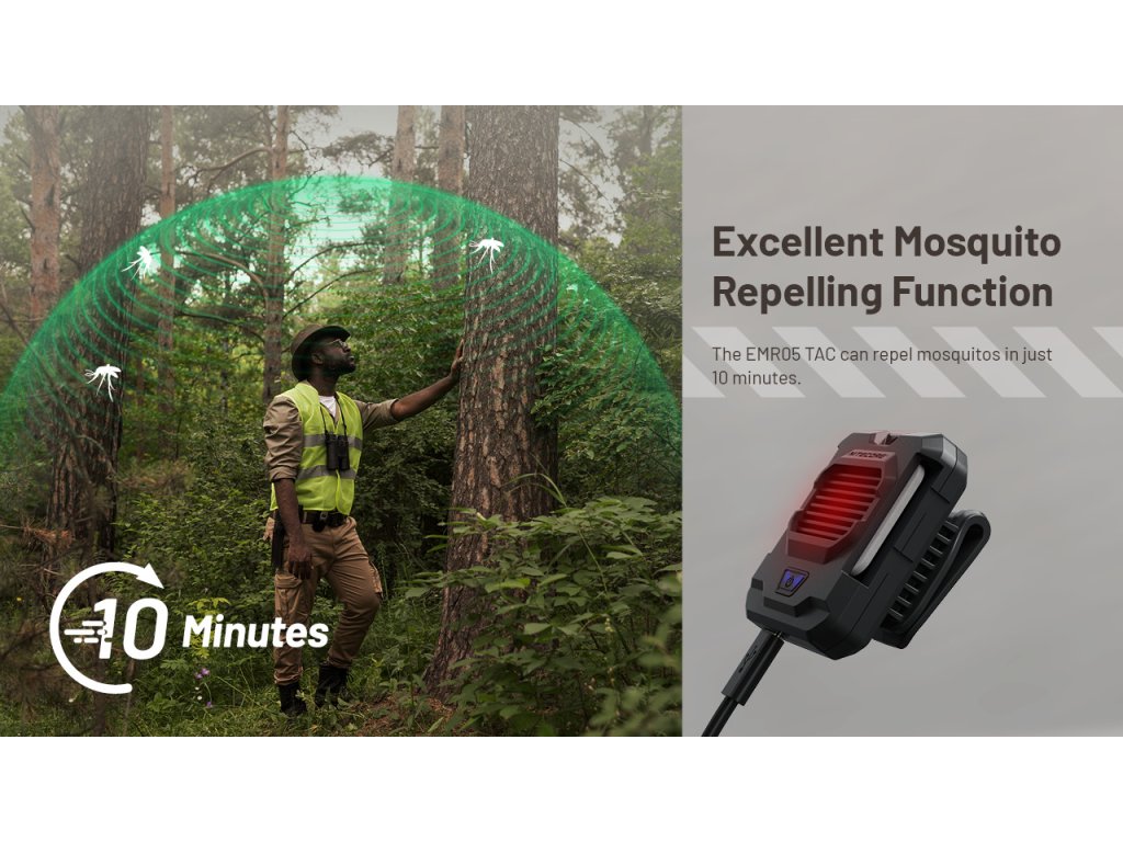 A EMR05 TAC személyes védőzónát hoz létre a rovarok ellen akár 5 m távolságig, körülbelül 10 perc alatt – permetek és szag nélkül. Cserélhető riasztóbetétekkel működik, és kizárólag külső áramforrásról üzemel USB-C (5 V / 2 A) csatlakozással. Beépített akkumulátorral nem rendelkezik, ezért használat közben folyamatosan power bankhoz, töltőhöz vagy más USB-forráshoz kell csatlakoztatni. Így mindig kéznél van a védelem – kempingezéskor, horgászatkor vagy utazás közben.
