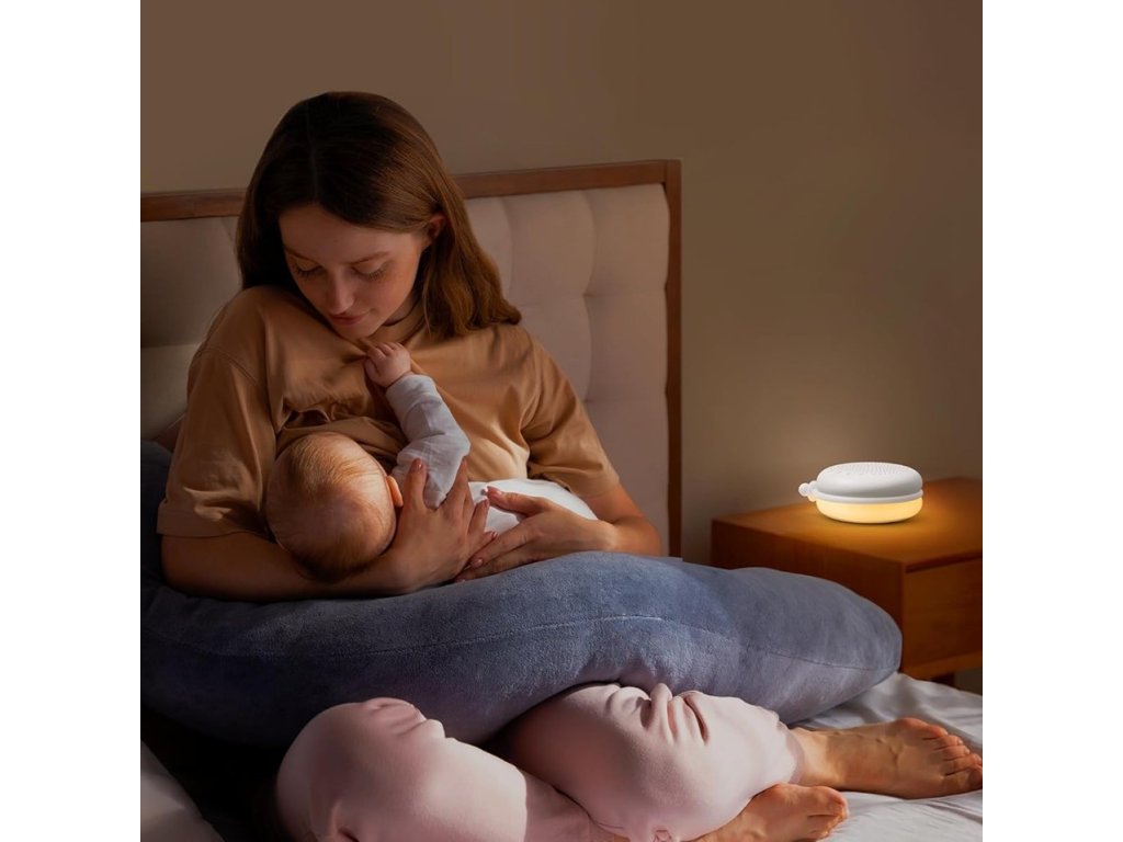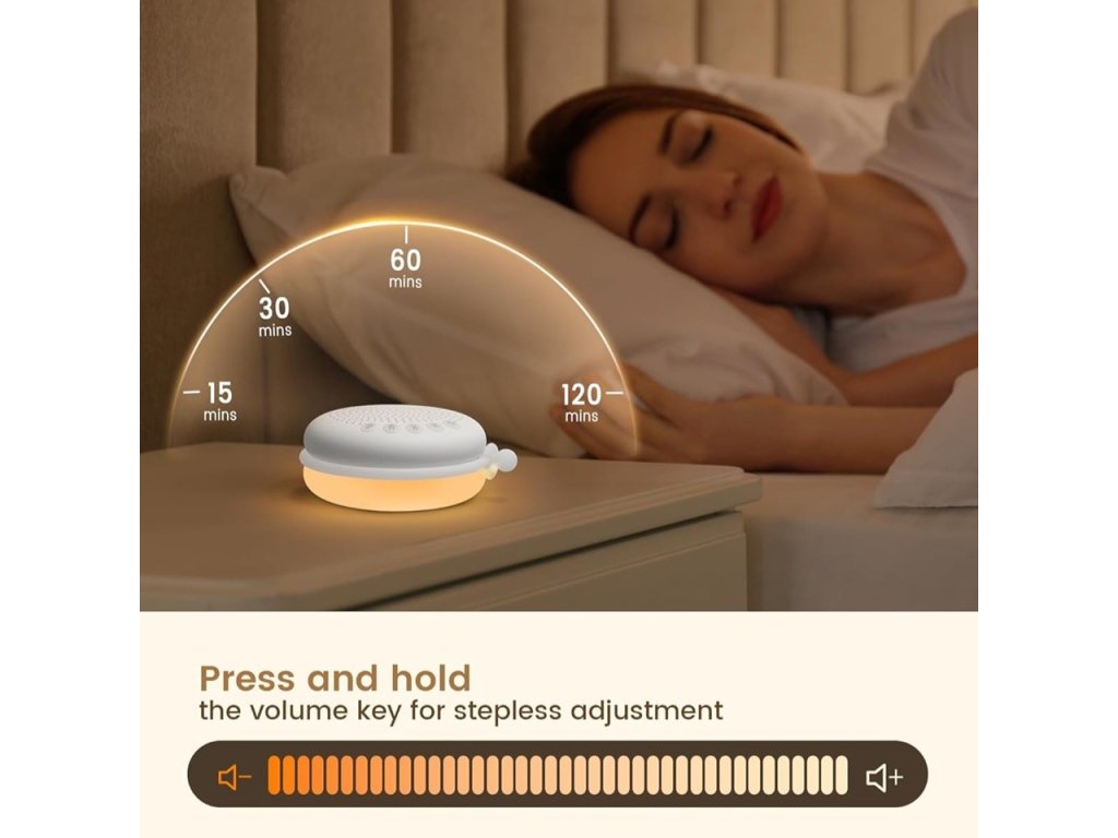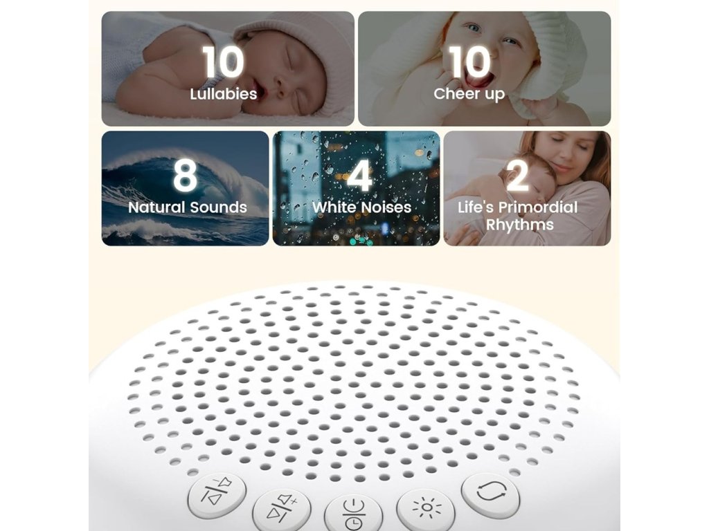 A készülék hang és fény kombinációját kínálja, amely megnyugtató légkört teremt, és segít a babának biztonságban érezni magát. A finom borostyánszínű fény nem zavarja az alvást, és ideális éjszakai szoptatáshoz vagy pelenkázáshoz. A fehér zaj és a természeti hangok elnyomják a környezeti zajokat, és elősegítik a mélyebb, nyugodtabb alvást – otthon és utazás közben is.