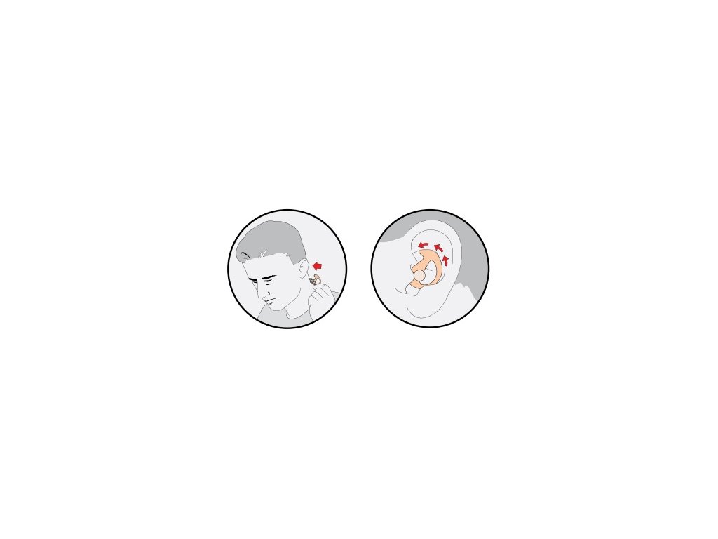Kezdje úgy, hogy az EarLock® rögzítőgyűrű enyhén hátrafelé mutasson. Forgassa előre a dugót, miközben az EP5 dugófejet (a rögzítőkeréken "R" jelzéssel) a jobb hallójáratba helyezi elég mélyen ahhoz, hogy a felső karimát tömítse. Állítsa a rögzítőgyűrűt a hallójáratot körülvevő kagylótál természetes körvonalához, hogy a dugókat a helyén tartsa.