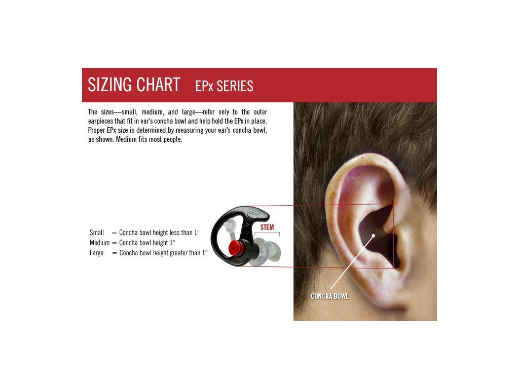 Az EP5 füldugók három méretben kaphatók: kicsi (S), közepes (M) és nagy (L). A helyes méret a kagylótálban lévő fül méreteitől függ. A közepes méret a legtöbb ember számára megfelelő. A legjobb mérethez azonban vessen egy pillantást az alábbi képre, amely kiválasztási útmutatóként szolgál.