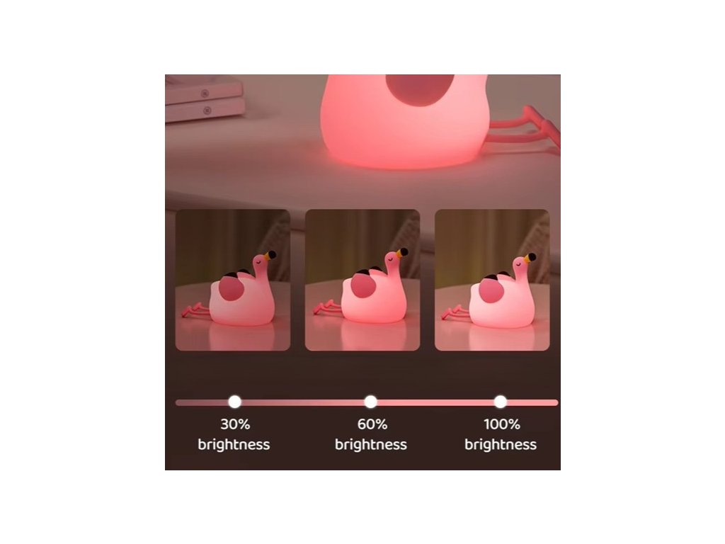 Ez a bájos, szilikonból készült flamingó alakú lámpa tökéletes kiegészítő a gyerekszobába vagy a hálószobába. Háromféle fényerősségű, meleg sárga fényt biztosít, amely segít megteremteni a nyugodt, pihentető hangulatot elalvás előtt. A lámpa élelmiszeripari minőségű, BPA-mentes szilikonból és ABS anyagból készült, így a legkisebbek számára is biztonságos. Aranyos formája miatt remek társ a gyerekszobába, de egyben kedves és stílusos dekoráció is.