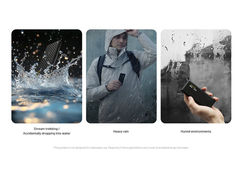 A powerbank intelligens hővédelemmel, túltöltés elleni védelemmel, pontos teljesítménykijelzéssel és optimalizált hatékonysággal rendelkezik töltés és kisütés közben. Természetesen rövidzárlat és túlfeszültség elleni védelem is be van építve. IPX7 tanúsítványa révén ellenáll az esőnek, hónak és magas páratartalomnak – tökéletes társ rossz időben is. A hegyi túráktól a kempingezésig bátran számíthatsz rá.