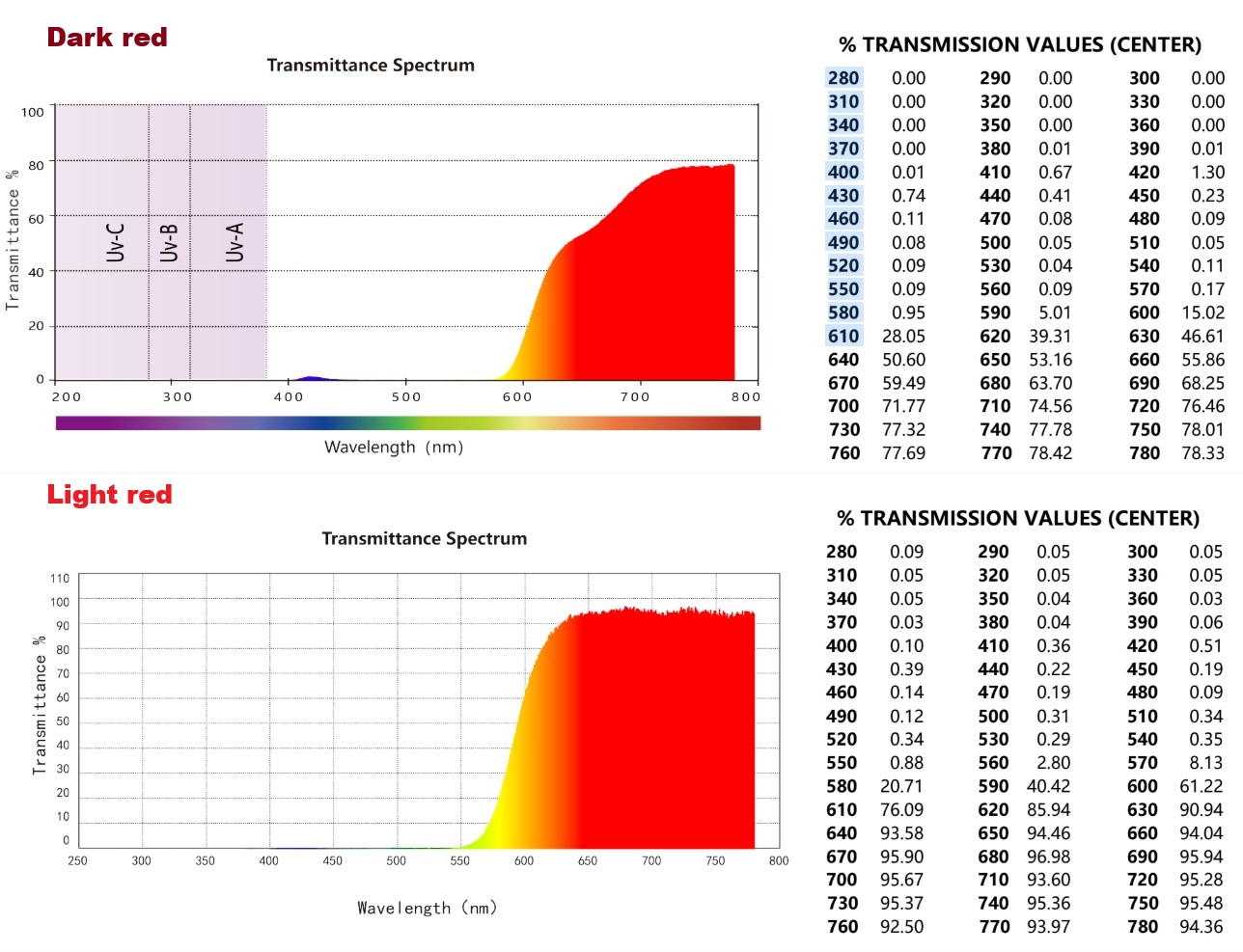 Ezzel szemben a sötétpiros szemüveg körülbelül 6,5% fényt enged át (4-es kategória), és maximális védelmet nyújt a kék és az UV spektrum teljes blokkolásával. Ezért különösen alkalmas esti használatra, pihenéshez lefekvés előtt vagy erős mesterséges megvilágítás mellett, mivel elősegíti a melatonin termelést és támogatja a természetes alvási ritmust.